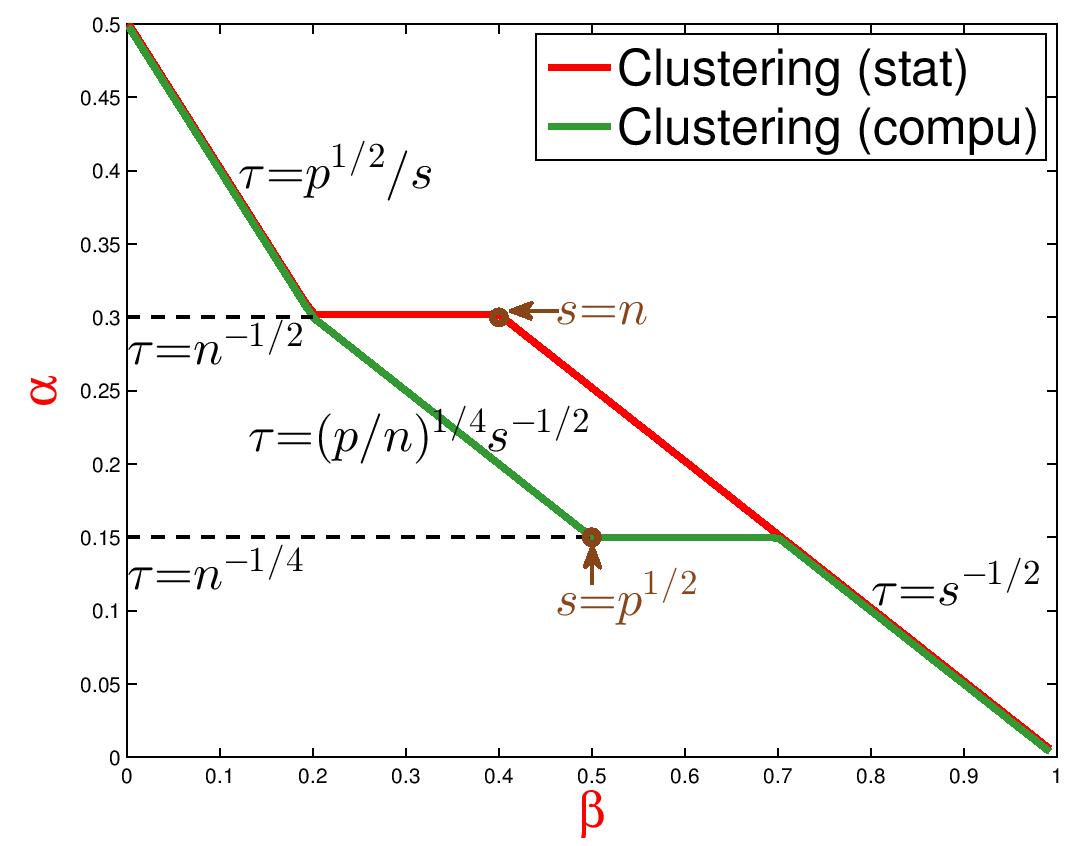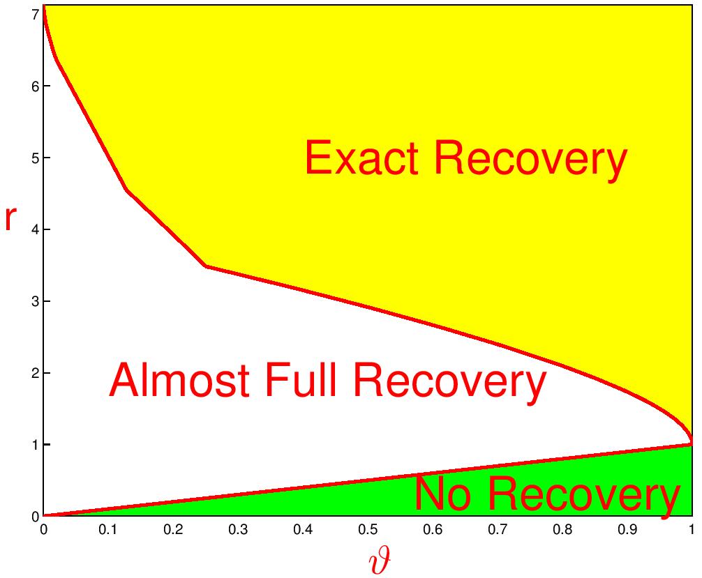 The Phase Diagram is a platform for accessing the fundamental limits of statistical tasks and studying optimality of methods in the Rare/Weak signal settings. The two-dimensional phase space calibrates the "signal rareness" and "signal weakness", respectively, and in different regions of the phase space, statistical inference is different. The figures above show the (theoretical) phase diagrams in my work for variable selection (left), clustering (middle) and detection of spiked covariance matrix (right).
